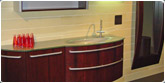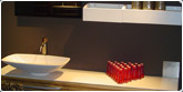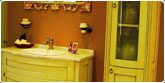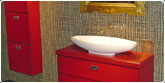 Estilo personal tanto en el modelo como en las formas, lacado en color vivo, distribución geométrica que rompe con el original lavabo y contemporáneo espejo en pan de oro. |
